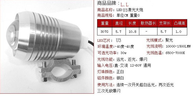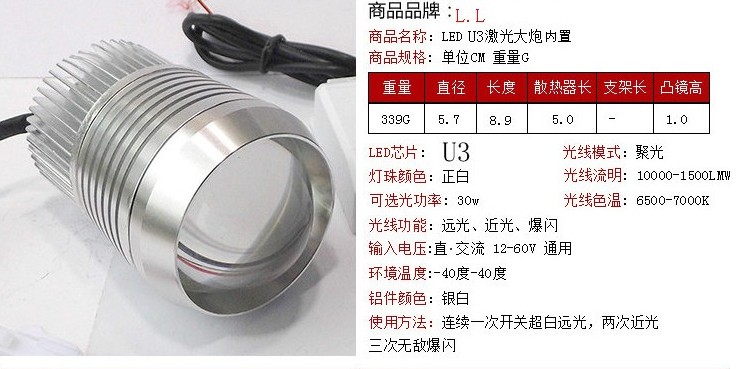 » 摩托车电动车U2激光炮外置内置灯爆闪摩托LED车灯